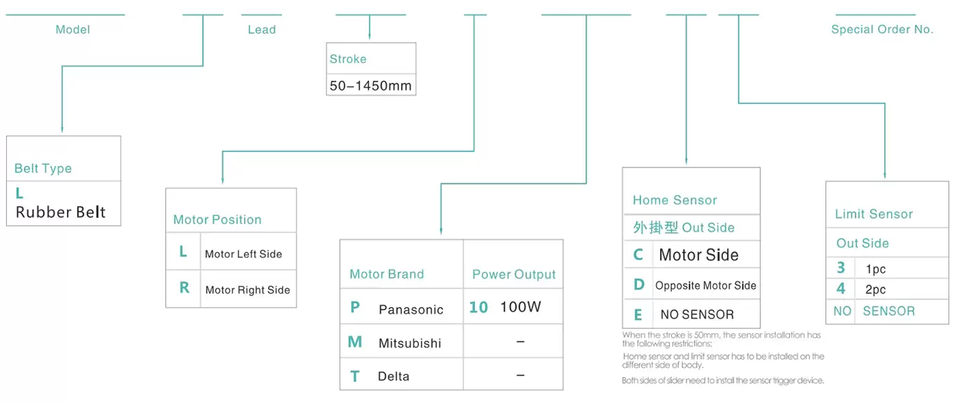 | 使用場所 | 駆動モード | モデル仕様 | 減速機構 | モーター出力 (わ) | 幅(mm) | 再現性 (ミリメートル) | ベルト仕様 | 最大積載量(kg) | 最高速度 (mm/秒)*1 | ||