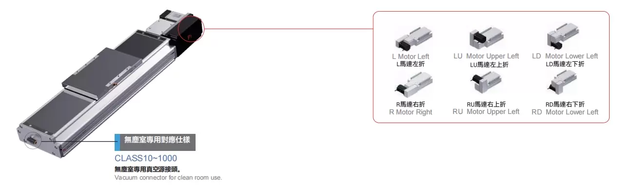 | 使用場所 | 駆動モード | モデル仕様 | 減速機構 | モーター出力 (わ) | 幅(mm) | 本体の高さ(mm) | 再現性 (ミリメートル) | ベルト仕様 | 最大積載量(kg) | 最高速度 (mm/秒)*1 | ||