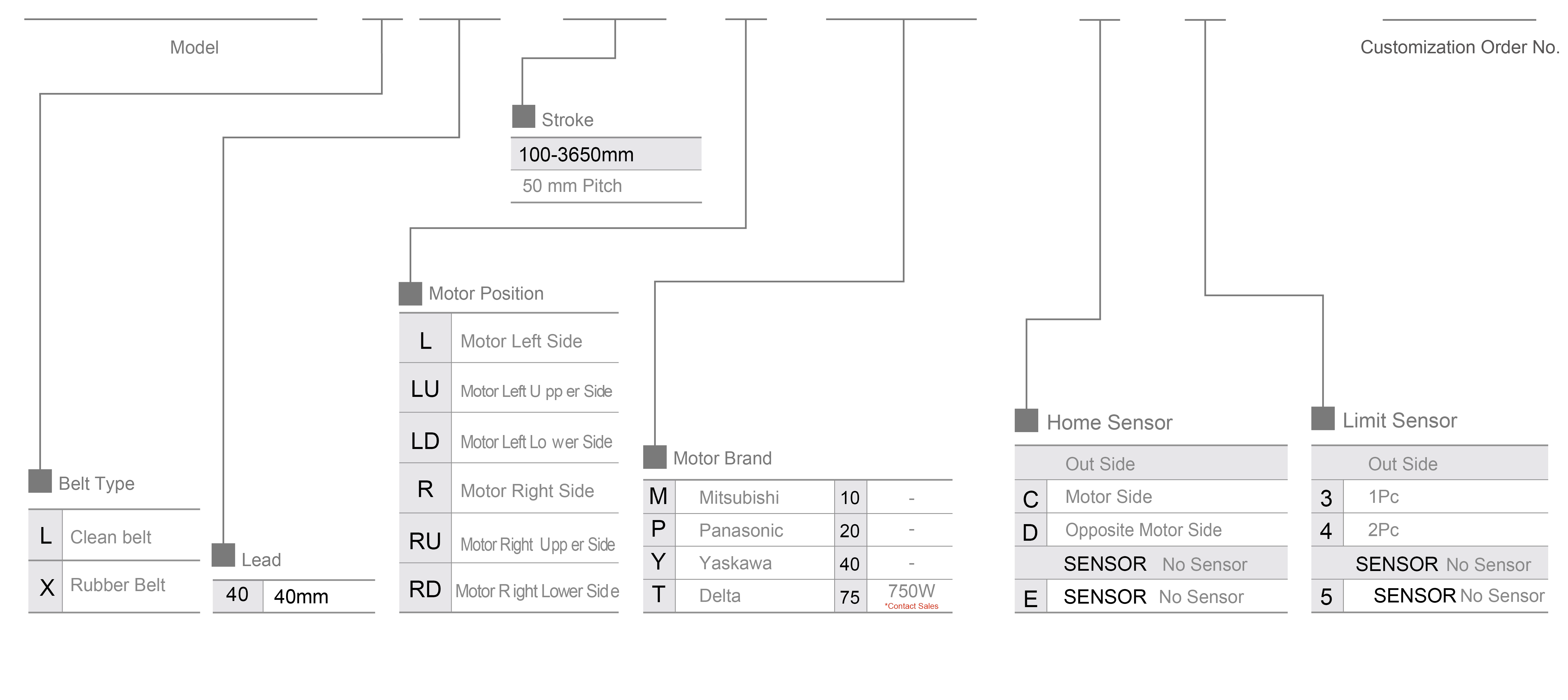 | 使用場所 | 駆動モード | モデル仕様 | 減速機構 | モーター出力 (わ) | 幅(mm) | 本体の高さ(mm) | 再現性 (ミリメートル) | ベルト仕様 | 最大積載量(kg) | 最高速度 (mm/秒)*1 | ||