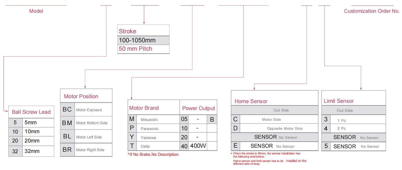 | 使用場所 | 駆動モード | モデル仕様 | モーター出力 (わ) | 幅(mm) | 体の高さ (ミリメートル) | 再現性 (ミリメートル) | ボールねじ仕様 | 最大積載量(kg) | 最高速度 (mm/秒)*1 | ||||||||||