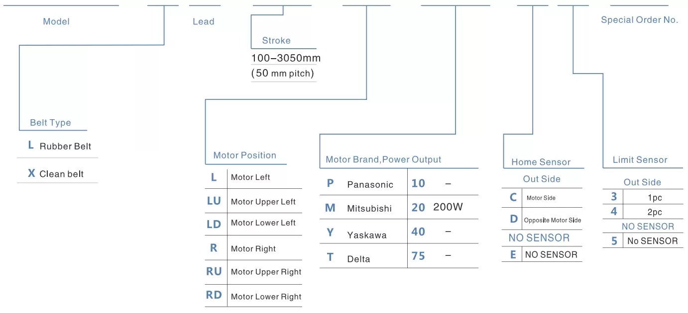 | 使用場所 | 駆動モード | モデル仕様 | 減速機構 | モーター出力 (わ) | 幅(mm) | 再現性 (ミリメートル) | ベルト仕様 | 最大積載量(kg) | 最高速度 (mm/秒)*1 | ||
