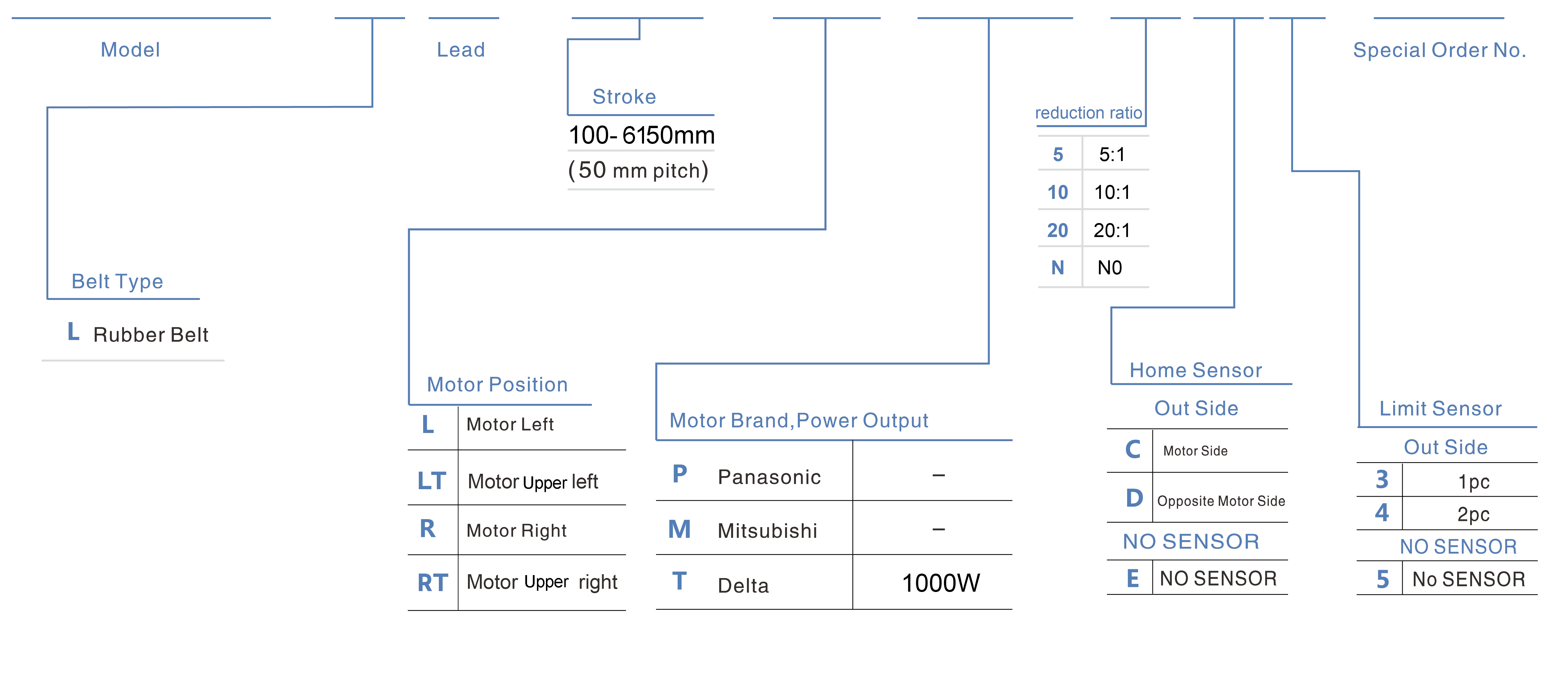 | 使用場所 | 駆動モード | モデル仕様 | 減速機構 | モーター出力 (わ) | 幅(mm) | 再現性 (ミリメートル) | ベルト仕様 | 最大積載量(kg) | 最高速度 (mm/秒)*1 | ||