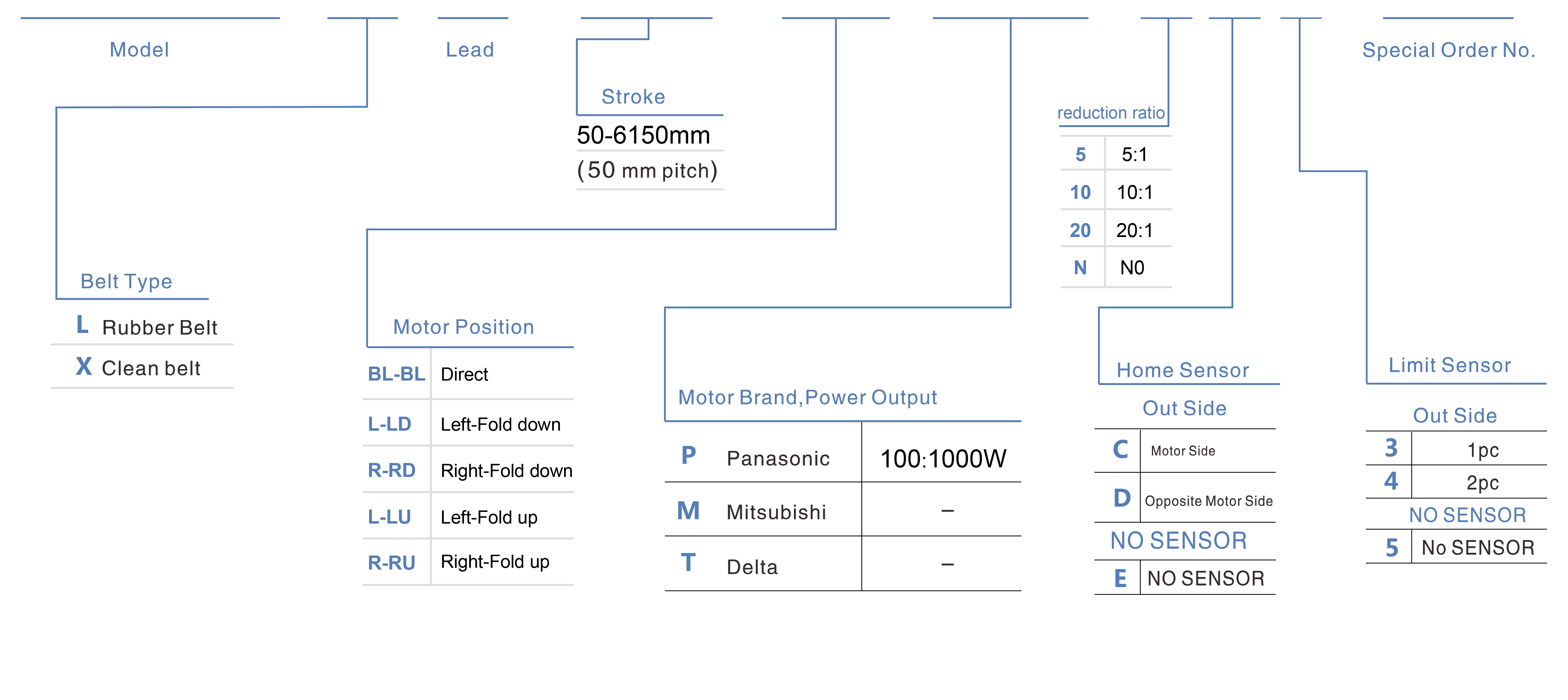 | 使用場所 | 駆動モード | モデル仕様 | 減速機構 | モーター出力 (わ) | 幅(mm) | 再現性 (ミリメートル) | ベルト仕様 | 最大積載量(kg) | 最高速度 (mm/秒)*1 | ||