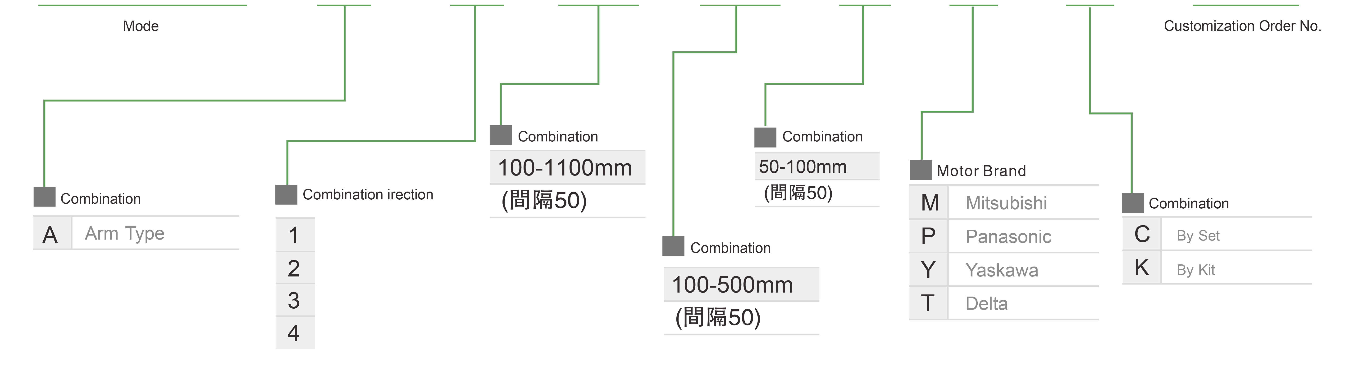 | 使用場所 | 駆動モード | モデル仕様 | 組み合わせ | 軸番号 | 鉛 | 最大速度(mm/s) | ストローク(mm) | ||||||
