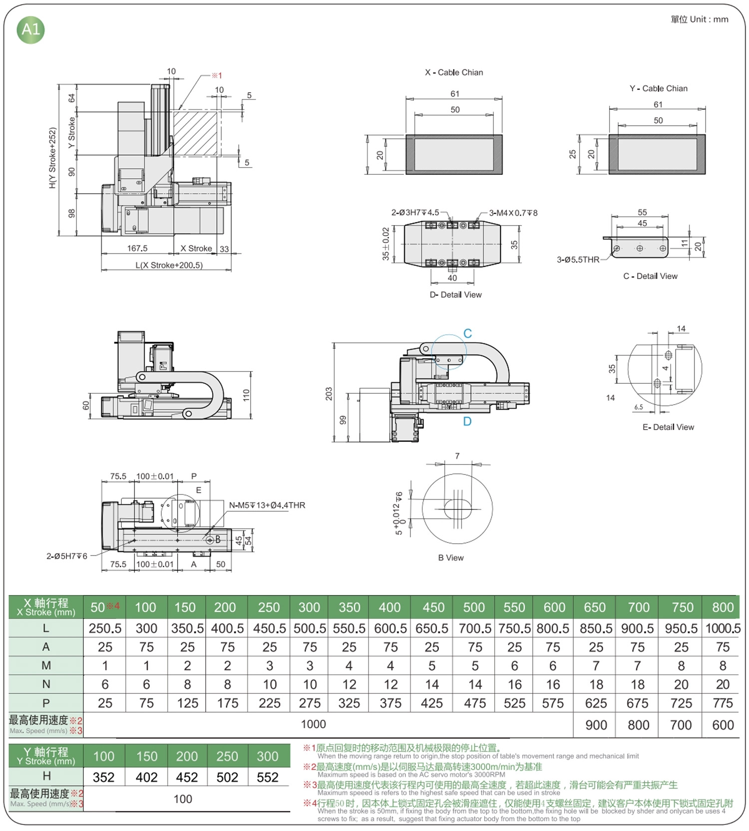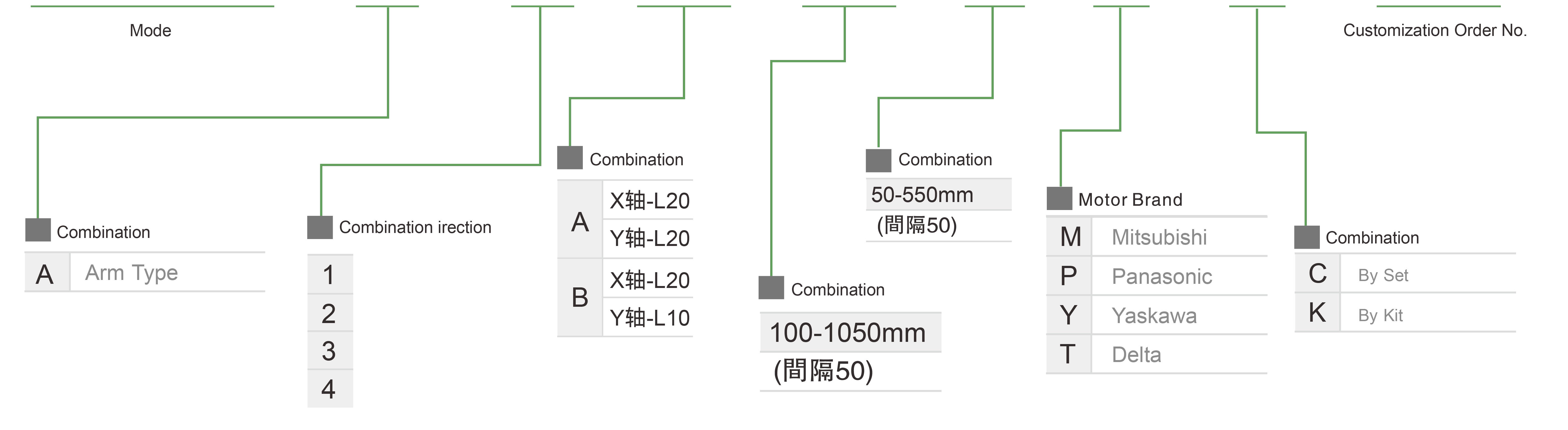 | 使用場所 | 駆動モード | モデル仕様 | 組み合わせ | 軸番号 | 鉛 | 最大速度(mm/s) | ストローク(mm) | ||||||