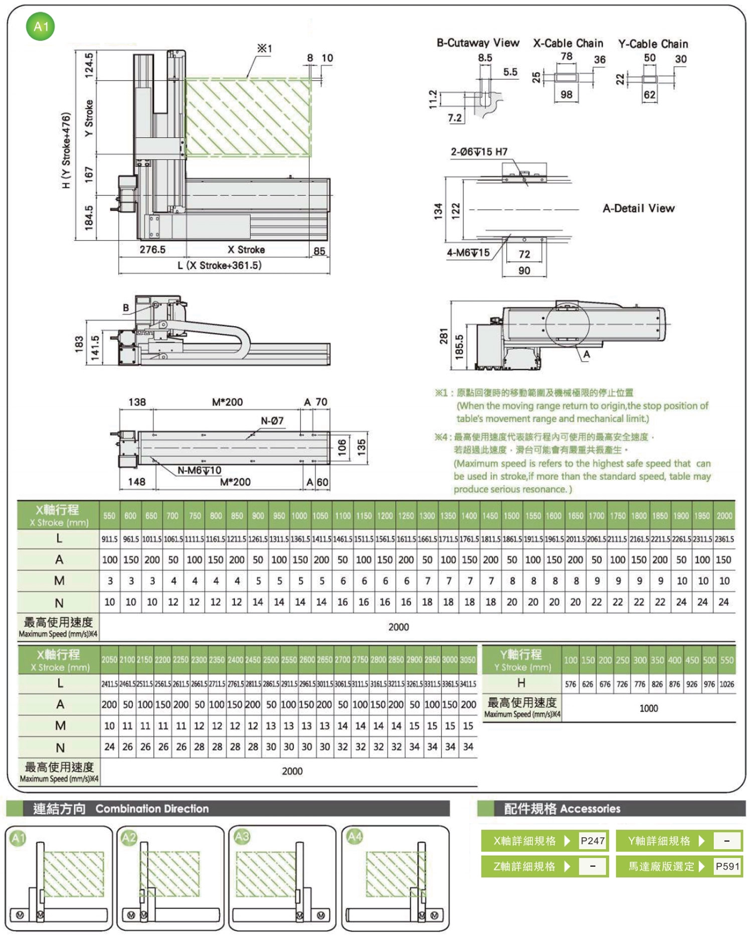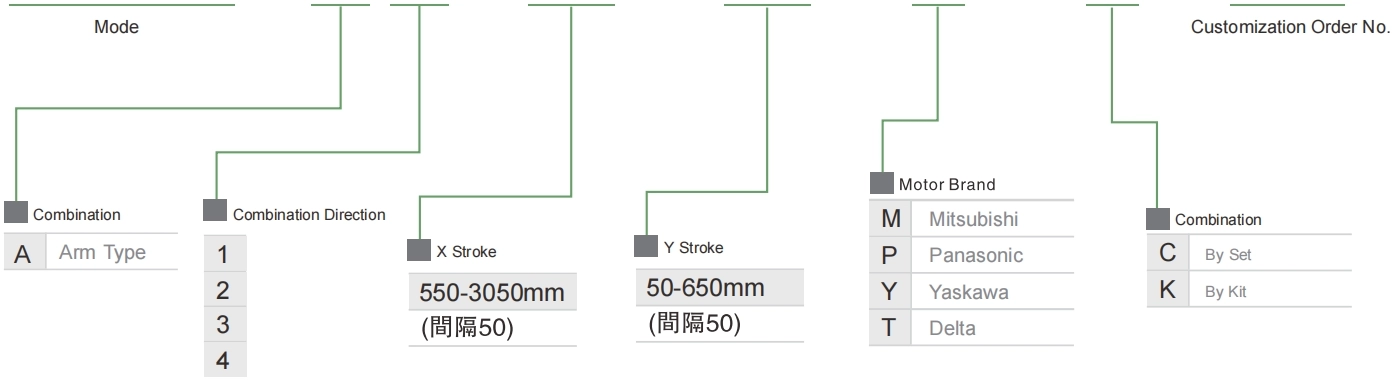 | 使用場所 | 駆動モード | 仕様 | 組み合わせ | 軸番号 | 最大速度(mm/s) | ストローク(mm) | ||||