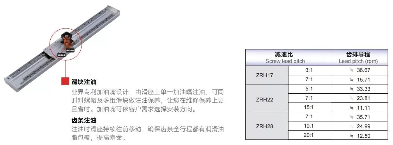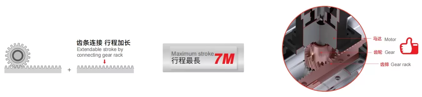 ギア駆動を採用しているため、長い移動距離でもネジの駆動がなく、ネジの巻き付きによる問題も発生しません。伝達構造はラックによって直線的に駆動されます。