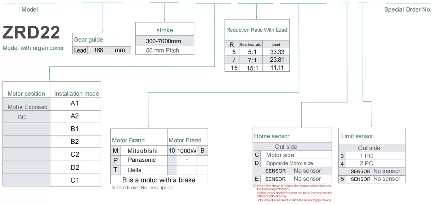 使用場所駆動モードモデル仕様モーター出力(W)幅(mm)繰り返し精度(mm)減少者の比率ヘリカルギアサイズ(mm)最大積載量(kg)