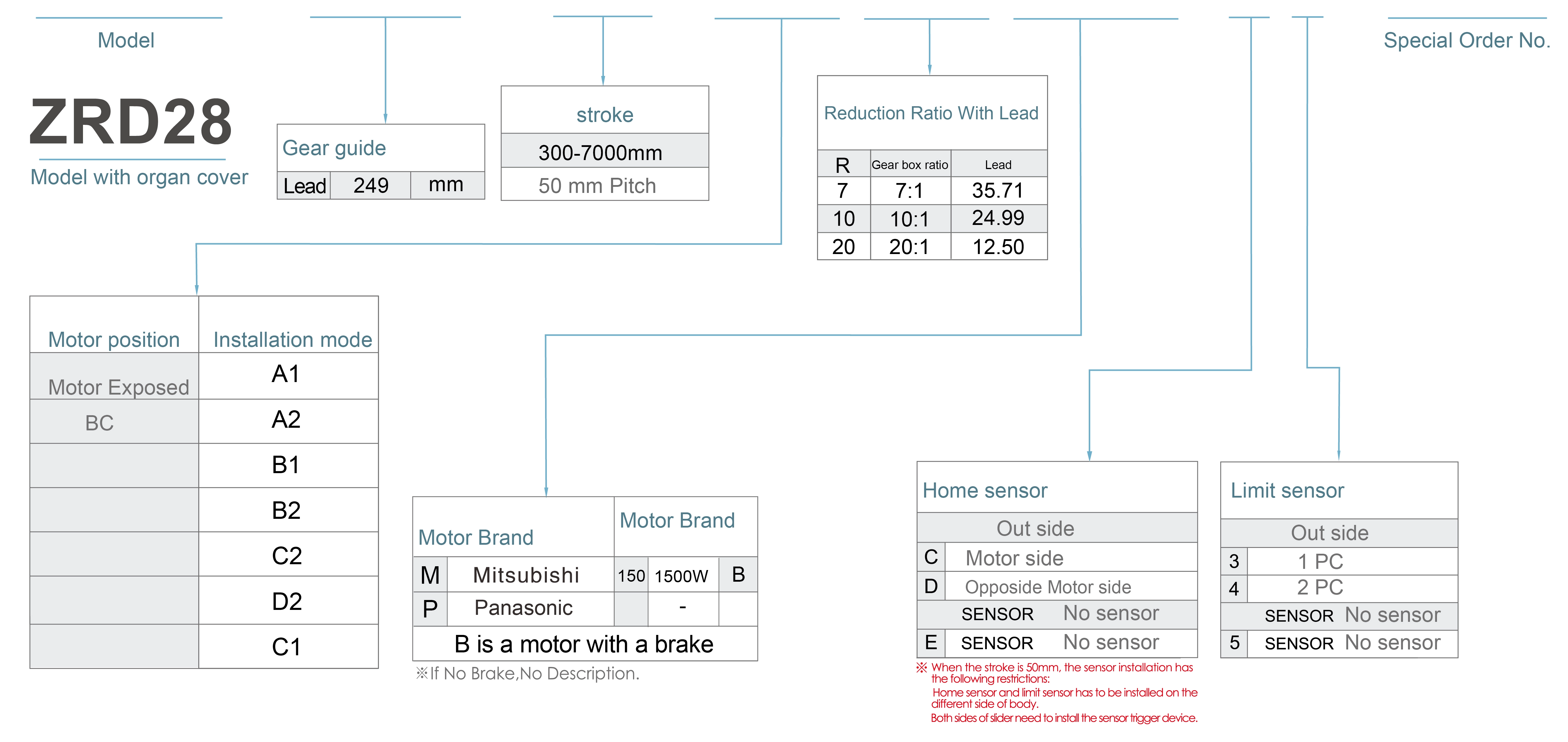 | 使用場所 | 駆動モード | モデル仕様 | モーター出力(W) | 幅(mm) | 繰り返し精度(mm) | 減少者の比率 | ヘリカルギアサイズ(mm) | 最大積載量(kg) | 最高速度 (mm/秒)*1 | |||